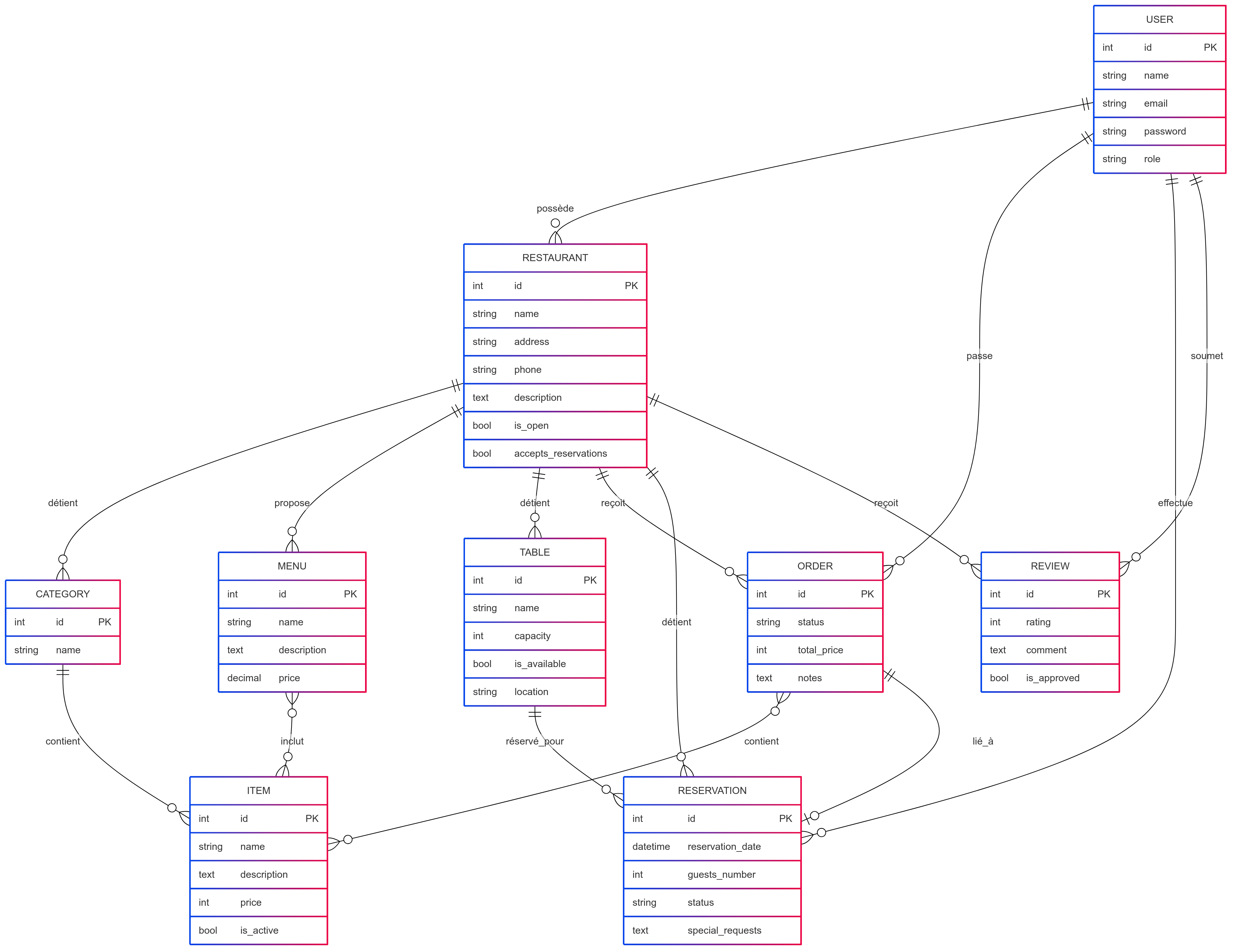 - Réservations liées aux tables et aux utilisateurs (clients)