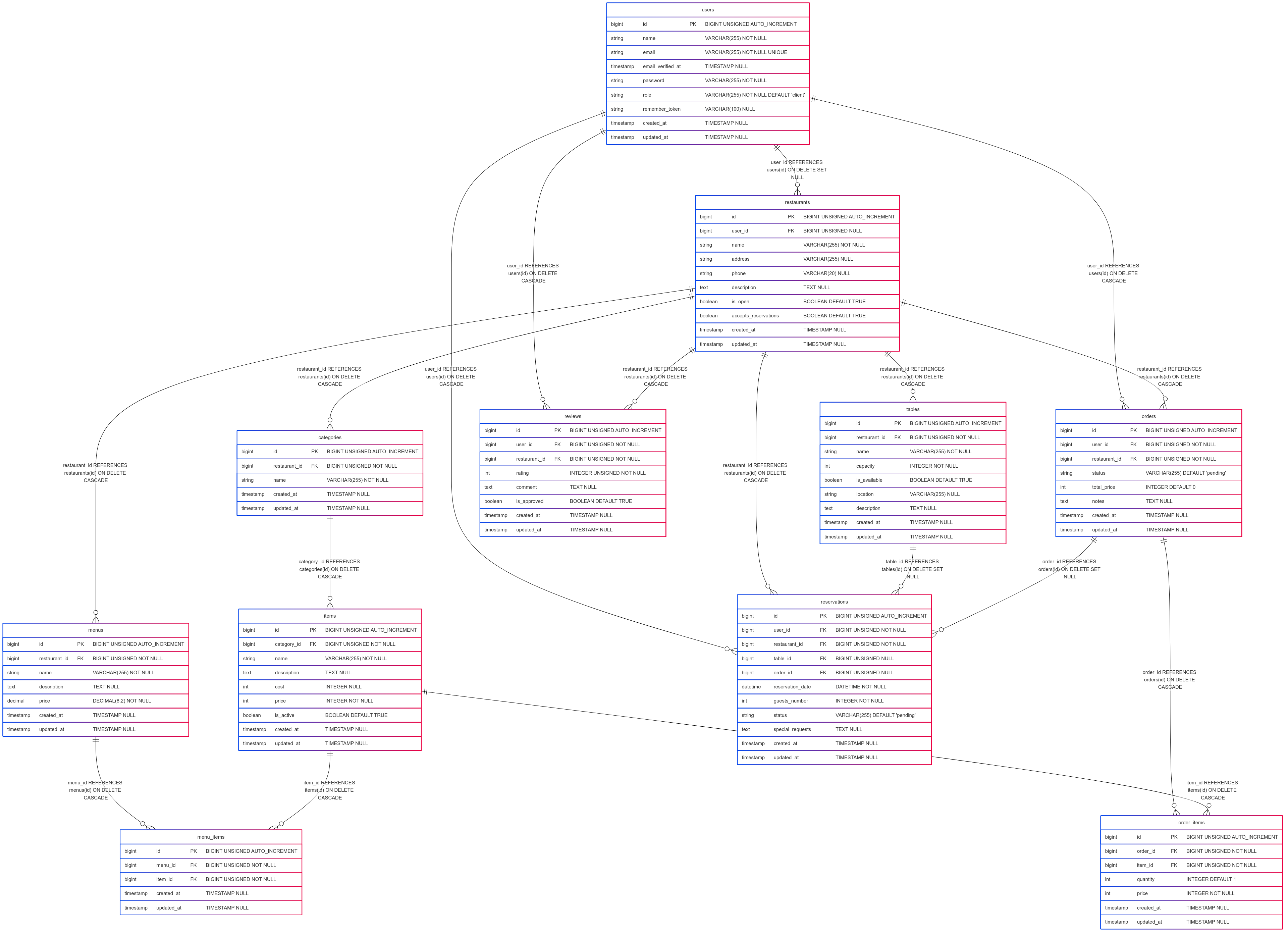 - Models : User, Restaurant, Category, Item, Menu, Order, Reservation, Table, Review
